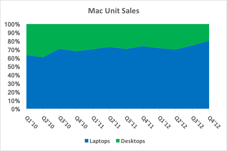 Considering the dominance of laptops in Apple's unit volumes, this is entirely expected and rational. Apple stopped breaking down its Mac units by category a few years ago starting in fiscal 2013. But up until fiscal 2012, it was pretty clear what category was driving sales: Laptop sales outnumbered desktop sales by 4-to-1 in Q4 2012.