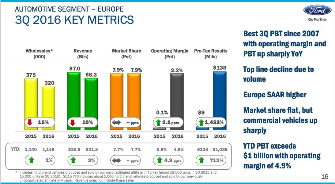 That restructuring effort has been a success. Ford Europe earned $138 million before taxes in the third quarter, up from just $9 million a year ago. Through the first three quarters of 2016, Europe has generated just over $1 billion in pretax profit for Ford.