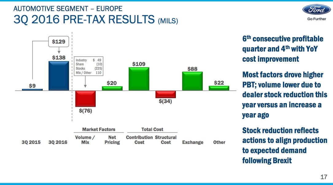 [Ford's management team in Europe] has done a wonderful job, and it's showing up in the results. And that's despite the fact, if you go to the left, you'll see we're starting to take actions in response to anticipated reductions in demand in the U.K. as OEMs start to price in a response to the weaker sterling. We certainly announced a price increase; a number of others have. In the quarter, our wholesales were down, our revenue was down. That was driven by those actions. Although actually, in the quarter, the SAAR ["seasonally adjusted annualized rate," a measure of the pace of auto sales] of U.K. was unchanged. But we think that will change over time as those price increases start to take hold.