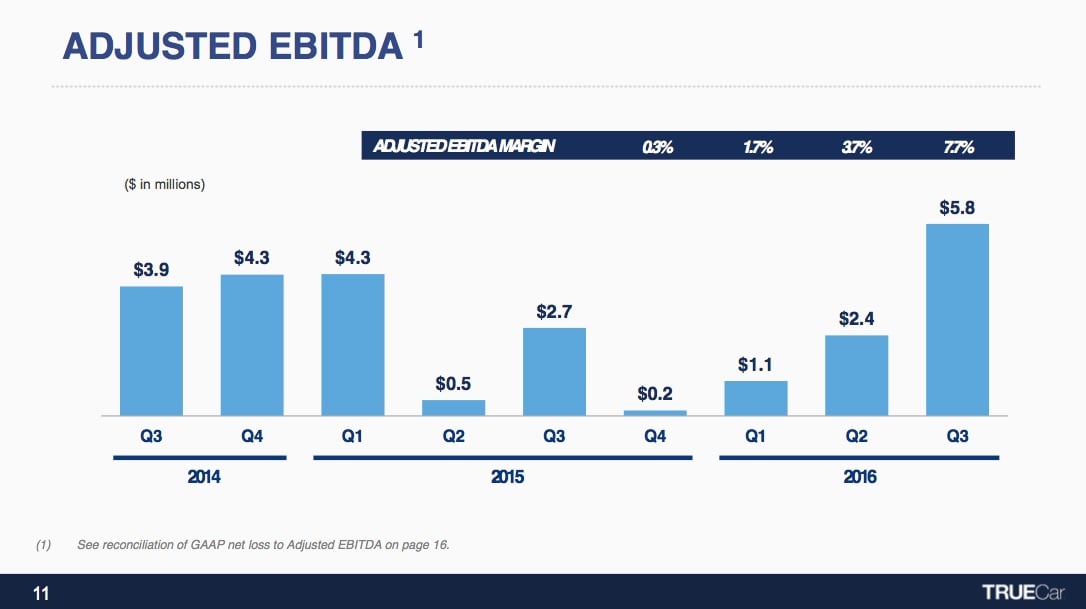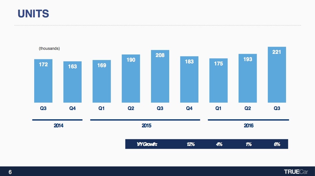 "We are really pleased with the financial results in the third quarter," CFO Mike Guthrie said during the earnings call. "Since the beginning of the year we've been making significant investments in three focus areas: dealer sales and service, product and technology, and consumer and dealer research. Each of these investments is yielding excellent returns and, as a result, we not only exceeded guidance on units, revenue, and adjusted EBITDA in Q3, but we also set ourselves up to build on these improvements as we finish 2016 and head into 2017."
