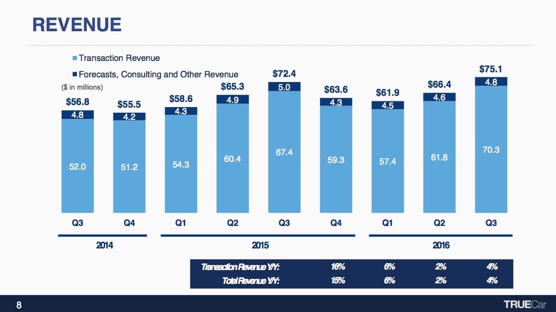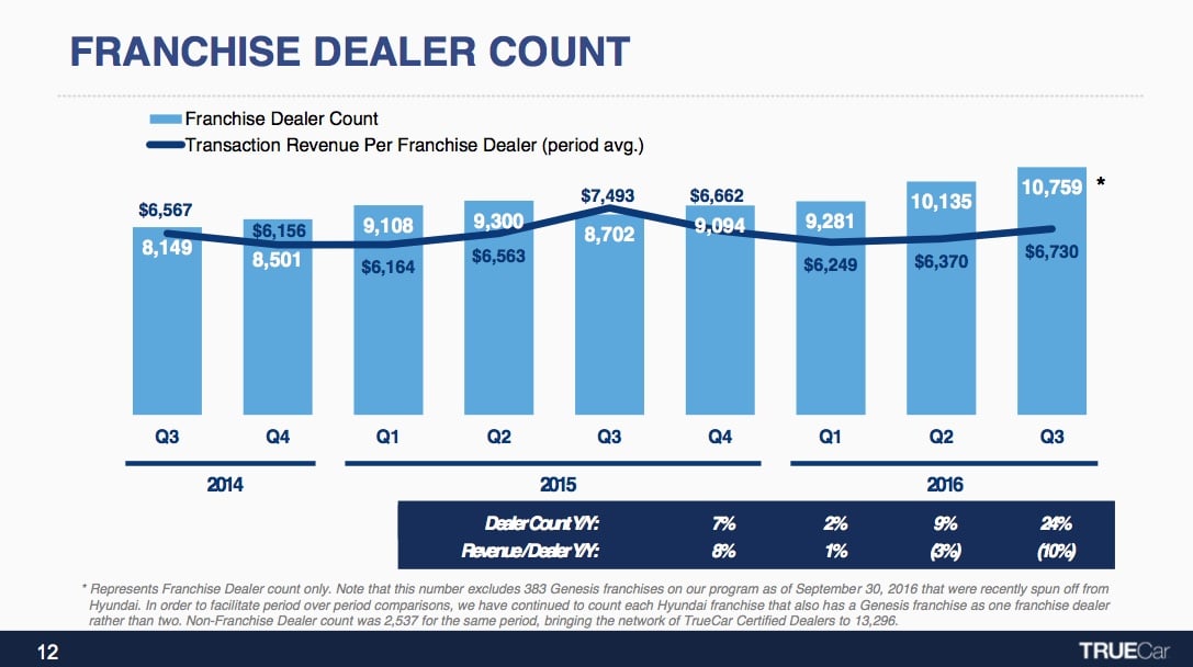Those relationships have improved throughout 2016, and the overall business has responded well. TrueCar ended the third quarter with 10,759 franchise dealer partners, up 6.2% from the end of the second quarter and its highest total ever. ("Franchise dealers" are those that hold a franchise from one or more automakers -- in other words, they're dealers that sell one or more brands of new vehicles. Independent dealers typically sell only used vehicles.)