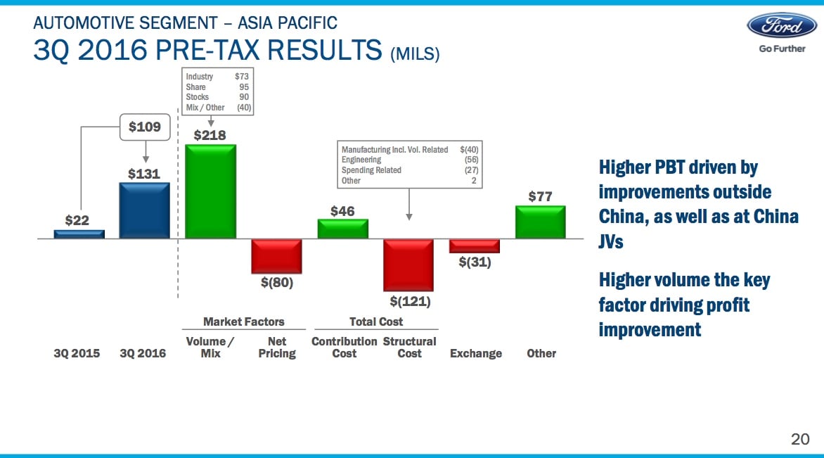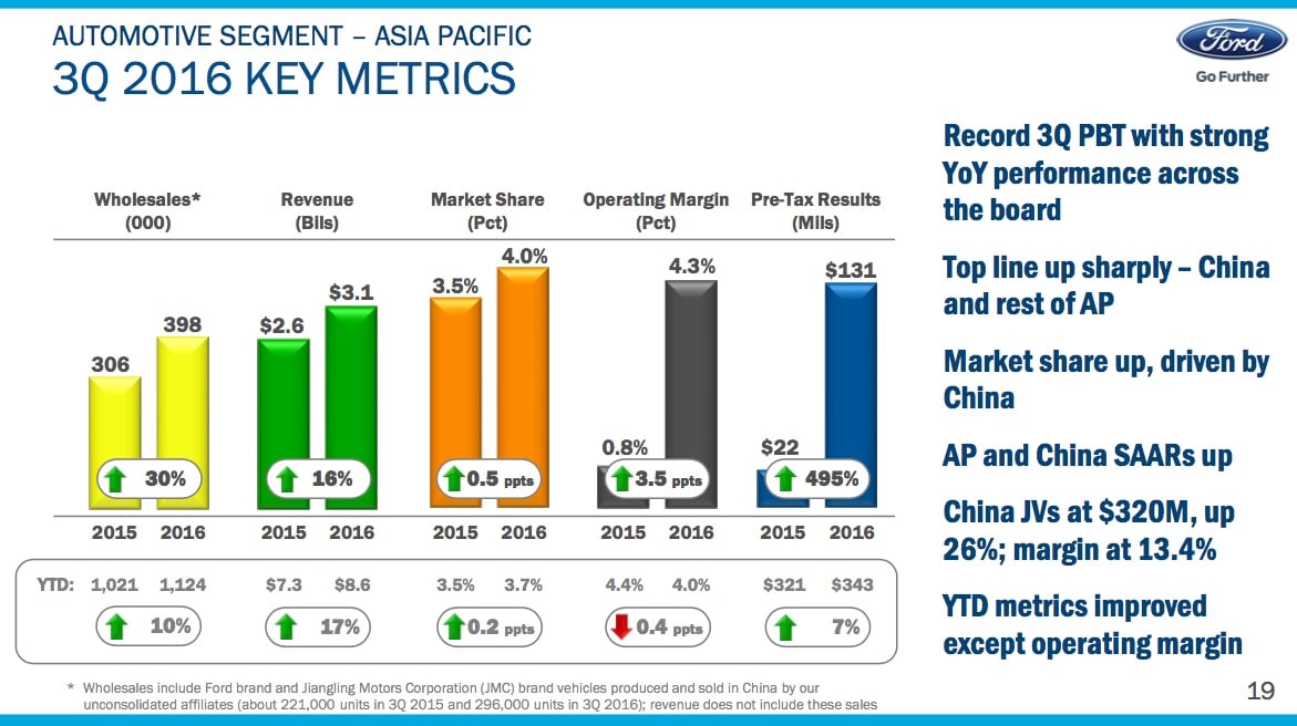 Ford's Asia Pacific unit earned $765 million before taxes in 2015. It earned $343 million on the same basis through the first three quarters of 2016.