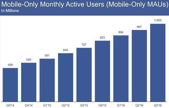 Facebook's (FB 1.22%) mobile business seems to be hitting new milestones every month. The most recent is the fact that for the first time ever, Facebook has reached over 1 billion users that exclusively use the service on mobile devices. Last quarter, Facebook had 1.06 billion mobile-only monthly active users (MAUs) accessing the service from mobile devices. Technically, using just the Messenger mobile app also qualifies, which Facebook hasn't really started to monetize, but that shouldn't undermine its progress.