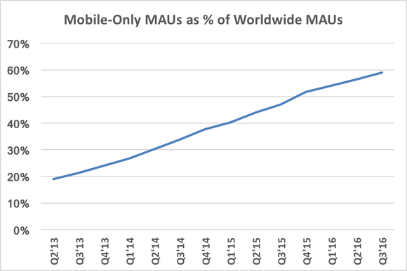 There are a number of different angles from which we can look at this data point. For starters, we can actually see a distinct and aggressive shift toward mobile-only usage, if we look at mobile-only MAUs relative to mobile MAUs (that also access Facebook on the desktop).