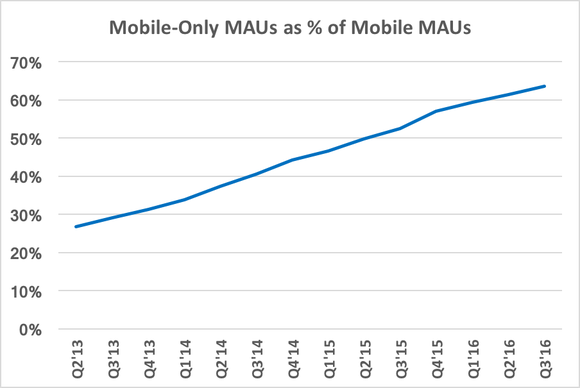 A few years ago, only about a quarter of mobile MAUs were mobile-only, but this figure has soared and now nearly two-thirds of mobile MAUs are mobile-only. It's also useful to look at the percentage of Facebook's overall MAU base that are mobile-only. The curve expectedly resembles that last chart.