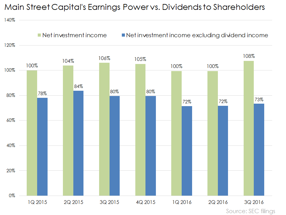 Dividend income that Main Street Capital earned from its portfolio companies fueled the increase in net investment income, increasing by $2.8 million (about $0.06 per share) from the year-ago period. The company said that $1.7 million (about $0.03 per share) of the increase in dividend income was "considered to be less consistent...or non-recurring."