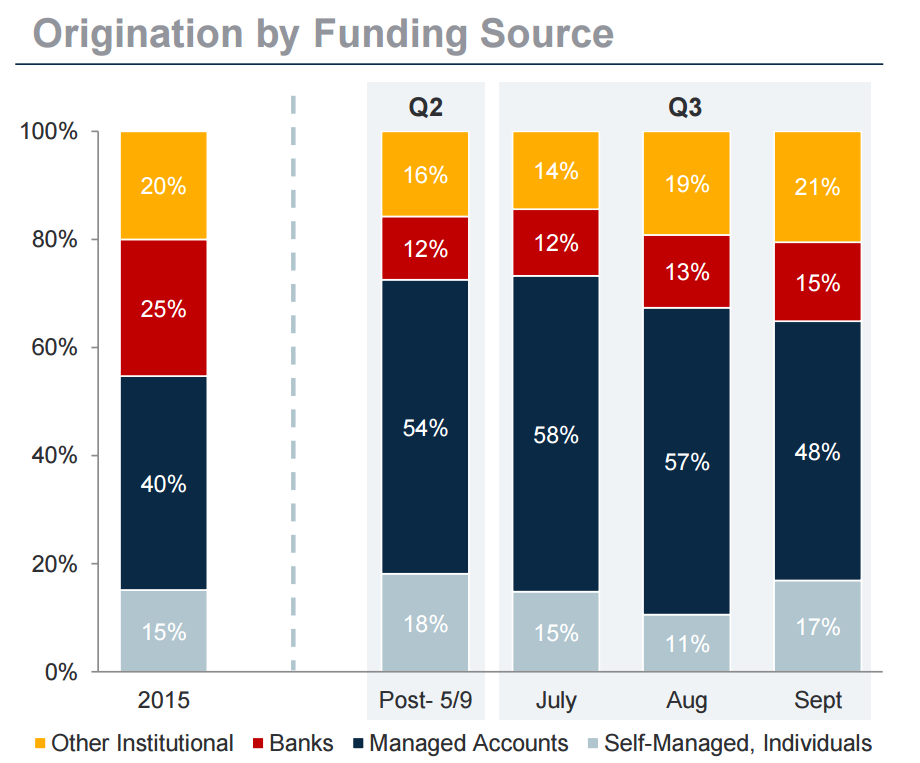 Banks purchased just 15% of its originations in September. LendingClub set a target to grow bank purchases of its loans back to 25% of total originations, roughly in line with banks' share of volume in 2015.