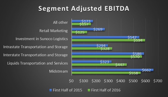 The bulk of Energy Transfer Partners' earnings comes from fee-based pipelines, which are relatively immune to commodity price volatility. Despite this, the company is not completely immune to the currently weak oil and gas market, as is evidenced by the fact that adjusted EBITDA in the first half of 2016 decreased 3% versus the year-ago period, while distributable cash flow was down 13%. Driving these declines were weaker earnings across several segments: