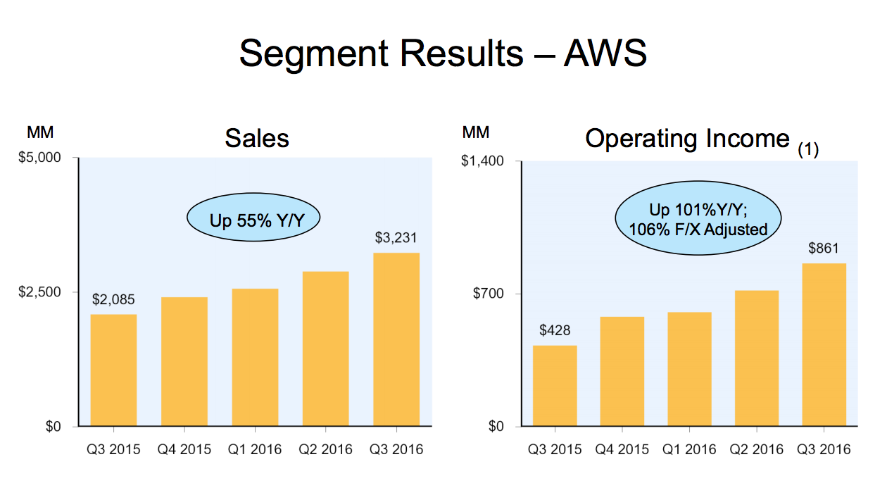 Amazon Web Services sales and operating income from Q3 2015 to Q3 2016. Image source: Amazon.com.