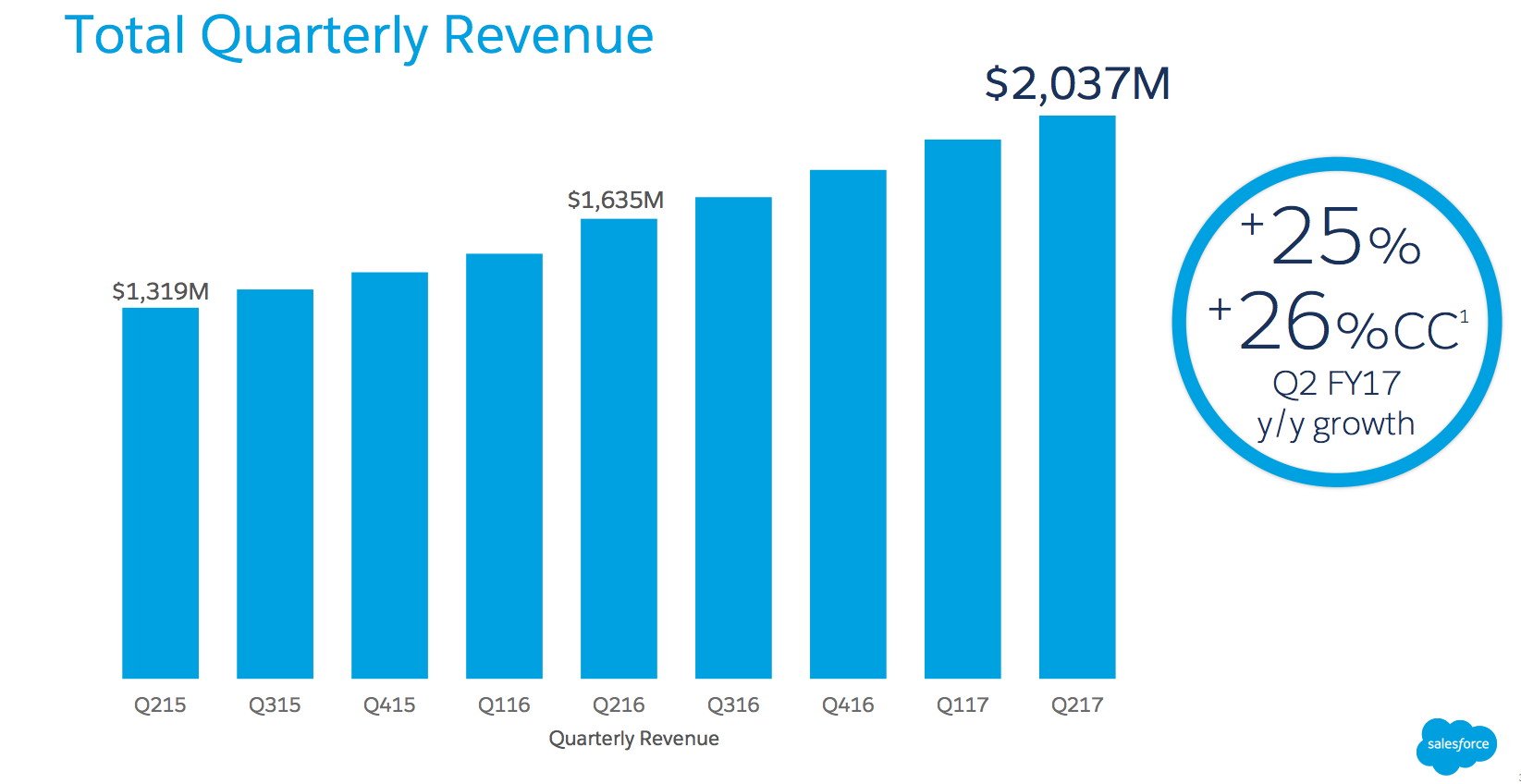 Salesforce total quarterly revenue from Q2 2015 to Q2 2017. Image source: Salesforce.com