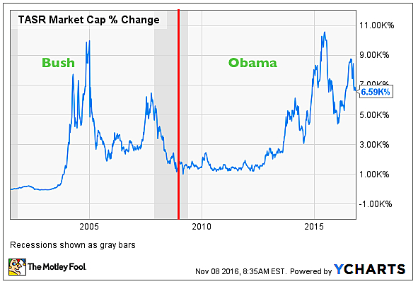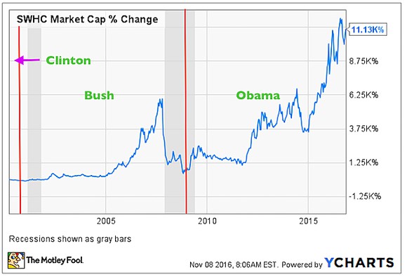 Many factors have come into play over the years, though presidential policies can determine the course of an industry. Yet as we've seen looking back over periods longer than just one administration, wide swings in value have occurred regardless of which political party is in office.