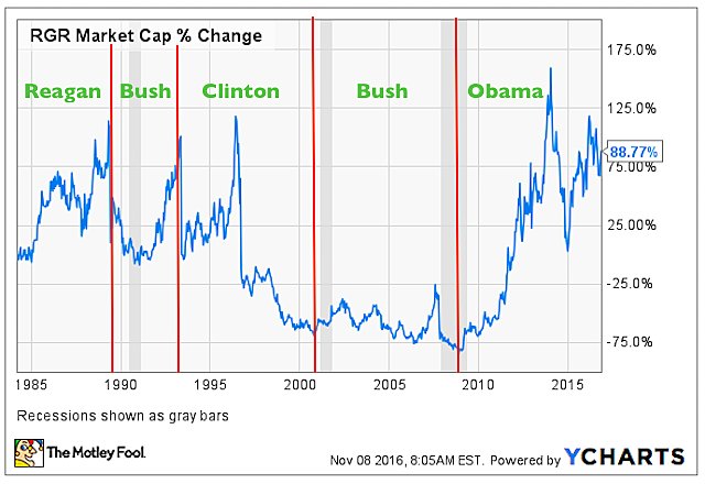 Sturm Ruger's (RGR +0.47%) history as a publicly traded stock goes back to 1969, so it's been through a few administrations of both parties, and while its stock gained some 67% (excluding the value of dividends) under the 41st president, George H.W. Bush, it lost 42% under his son, George W. Bush, the 43rd president.