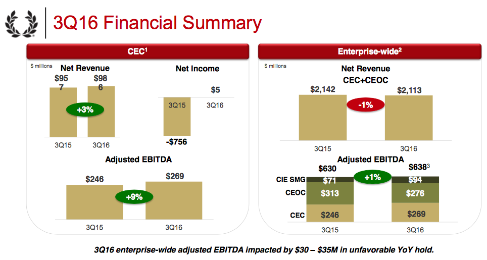 We don't get a detailed look at how CEOC performed on a resort basis in the quarter, but the do give us a few indicators. The first is that revenue was down at the unit by more than what CEC gained because revenue for the combined company was down 1% to $2.1 billion. More importantly, adjusted EBITDA fell from $313 million a year ago to $276 million.