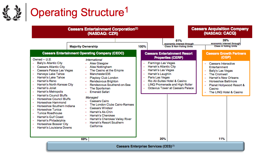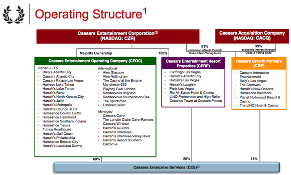 Before getting to the numbers, I need to lay out the company's corporate structure, which is outlined below. It's a complicated tangle, but for reporting purposes, the company is split between Caesars Entertainment Company (CEC), which owns CEP and CGP, and the bankrupt CEOC.