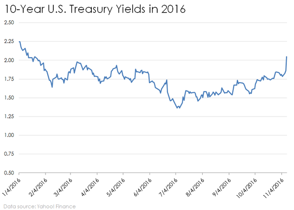On Wednesday, the yield on 10-year U.S. government notes crossed 2% for the first time since January 2016. It may seem insignificant, but 10-year Treasury yields are now about 50% higher than the low struck in July 2016. That's a very big deal.