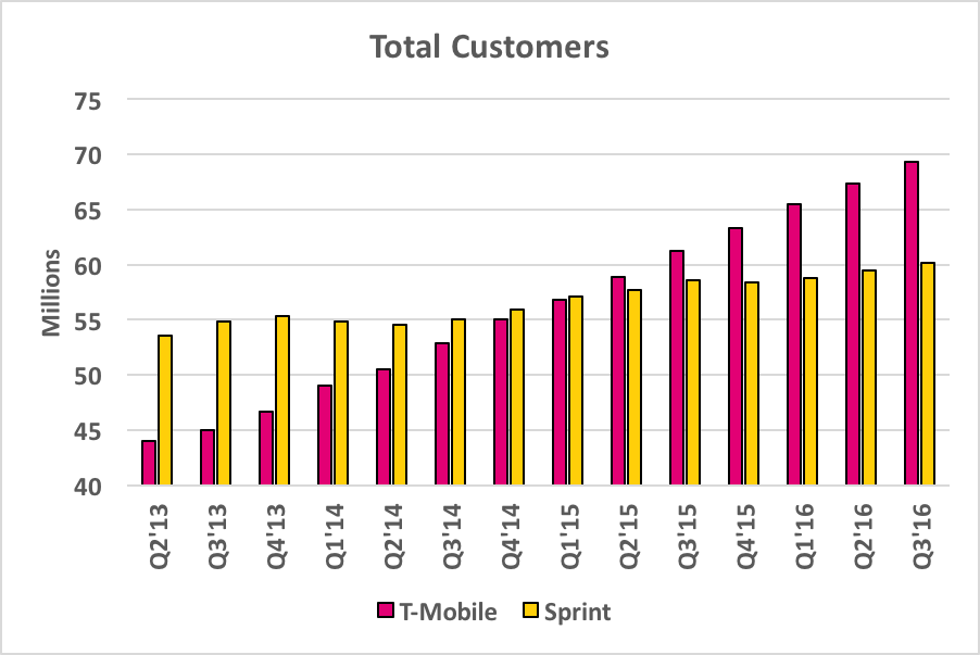 But operationally, Sprint continues to fail in terms of actually winning over customers in a meaningful way. Un-carrier T-Mobile (TMUS +0.78%) officially overtook Sprint last year as the No. 3 domestic wireless carrier, making good on a promise that T-Mobile CEO John Legere made in 2014. In fact, T-Mobile has only widened its lead ever since taking the No. 3 spot, while Sprint's customer base languishes.