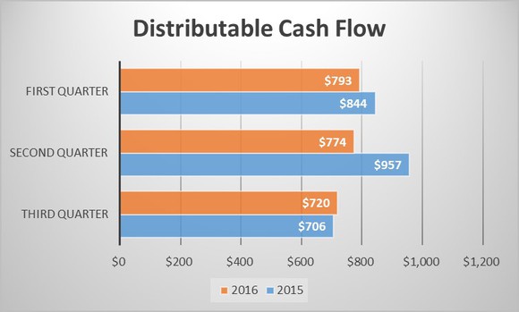 That recovery helped keep distributable cash flow from falling as deeply as it had in prior quarters: