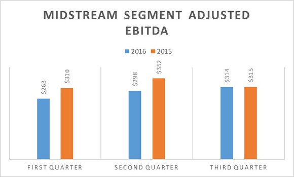 As the following chart shows, that segment had significantly underperformed last year's tally through the first two quarters before finally pulling back toward even during the third quarter. Driving that improvement were higher oil and NGL prices, which lifted its non fee-based margins, as well as higher volumes in the Permian Basin. These factors helped offset weaker volumes elsewhere as well as an increase in costs enabling the midstream segment to show some much-needed improvement.