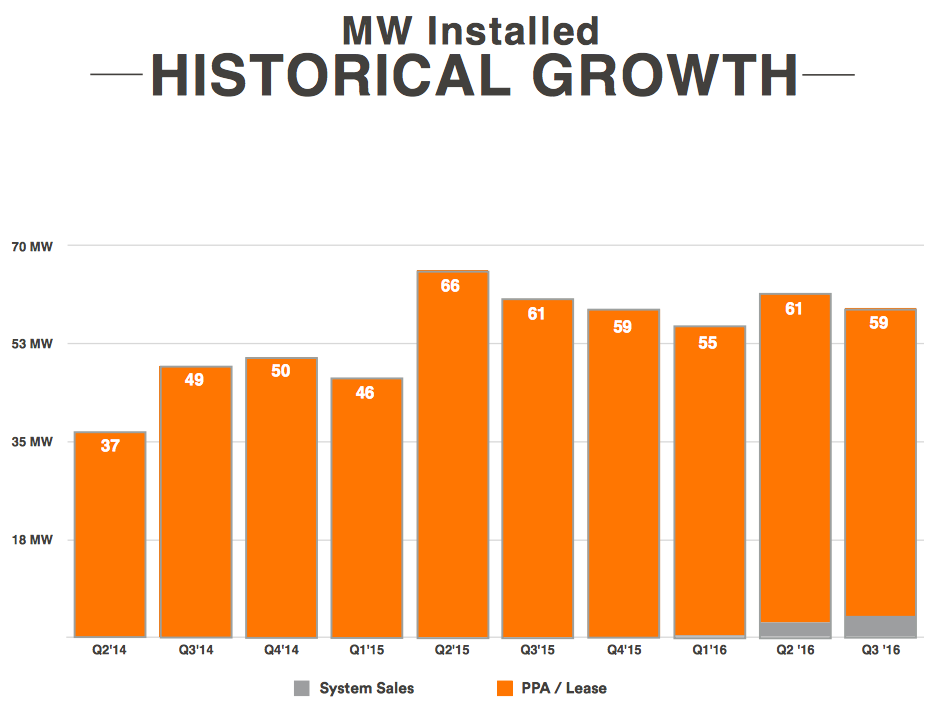 The big story is that installations fell slightly in the third quarter to 59 MW and installations have been flat for a year and a half. But notice that system sales is growing and that'll be a key that I'll cover more below.