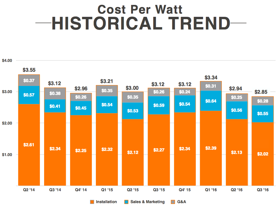 The other important number to watch is cost per watt. After struggling with rising sales and marketing costs early this year, you can see that Vivint Solar has lowered costs to $2.85 per watt, the lowest in its history.