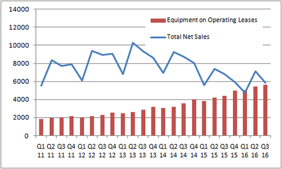 However, what's new is the way Deere has built up the amount of equipment it has on operating leases -- this is where a farmer prefers to lease equipment rather than make an outright purchase. The following chart shows leases have grown as sales have fallen.