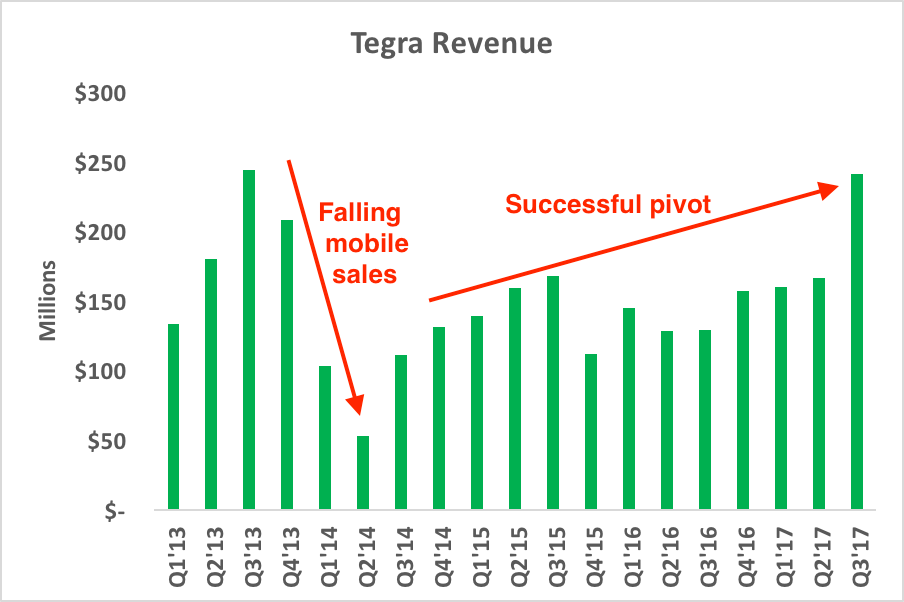 Over the years, NVIDIA had spent billions of dollars developing Tegra, so when it announced that it was getting out of smartphones in 2014 and pivoting the Tegra business to automotive applications, there was all sorts of uncertainty regarding the Tegra business. After all, it's not uncommon for strategic pivots to fail. In itself, NVIDIA's smartphone exit wasn't too surprising; Texas Instruments had bailed on mobile processors just two years prior, for many of the same reasons.