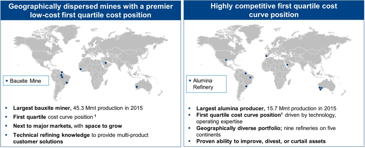 All of Alcoa's bauxite mining happens outside the U.S., and only one of its alumina refineries -- worth about 13% of Alcoa's total refining capacity -- is a domestic asset. But with the vast majority of the world's bauxite located outside North America, it only makes sense that Alcoa's raw-materials operations would happen in proximity to where the raw materials are found.