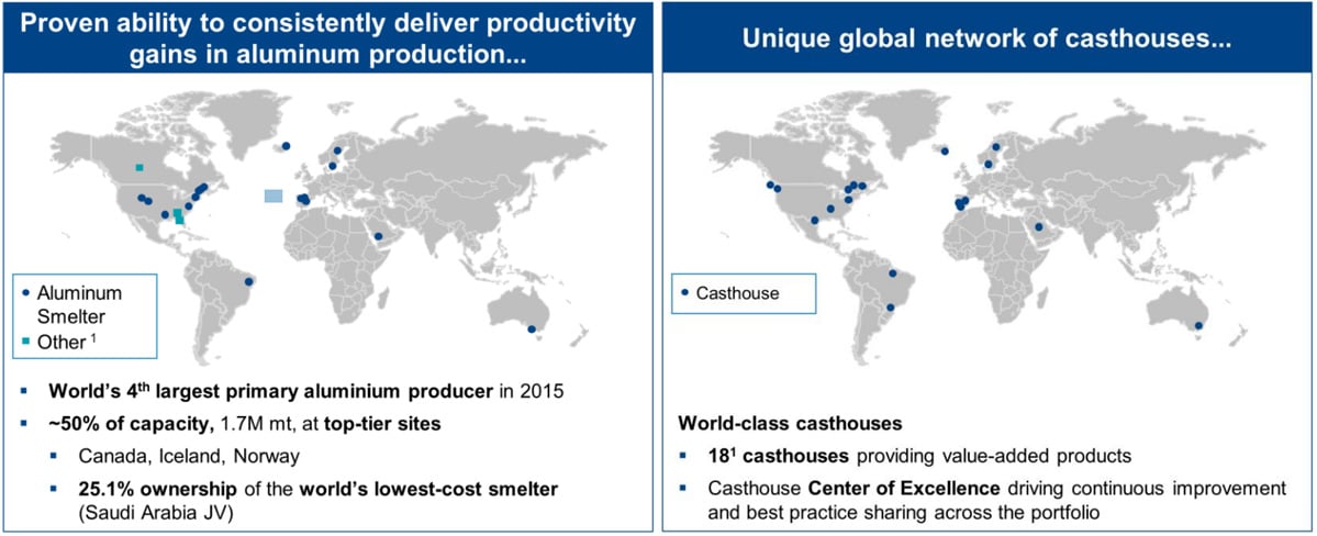 Alcoa has a significant aluminum production presence in the U.S., with about 31% of its aluminum smelting in the U.S., and another 25% in Canada. But it's worth noting that Alcoa has been cutting its domestic aluminum smelting, having closed its smelting operation near Evanston, Ind., earlier this year, with management bluntly saying that "Despite the hard work of employees, these assets are not competitive." The company also closed its Port Comfort, Texas, alumina refining operation in 2016.