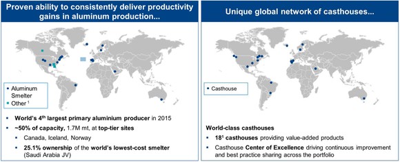 Aluminum casting, however, is heavily dependent on North America and Europe and typically best suited to be located close to customers. Alcoa says 96% of its casting segment's revenue comes from North America and the EU. Further, Alcoa is the No. 1 aluminum billet producer and the second-largest aluminum slab producer in North America. These two products are important for transportation, industrial, and packaging manufacturers. The company is North America's largest food-can producer and second largest drink can sheet producer, and it's aiming to have more than 13% of the North American automotive sector by 2020.