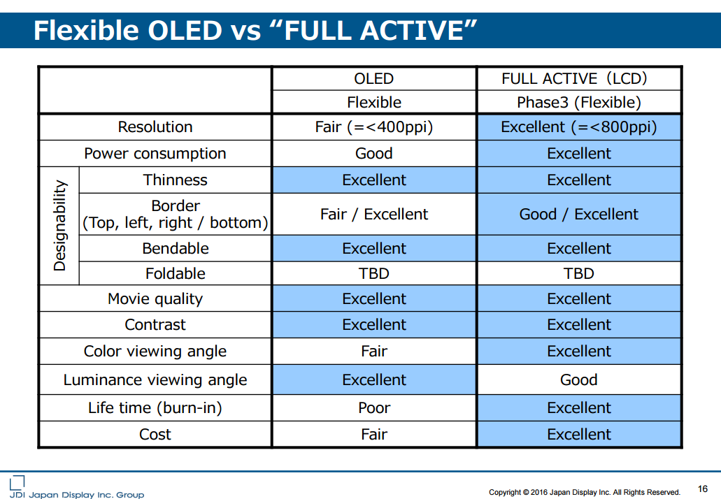 This table from Japan Display shows a table pitching the advantages of Japan Display's yet-to-be-released third-generation full active LCDs against OLED technology: