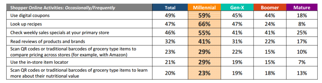 There is one characteristic grocers and shareholders understand and probably agree upon regarding this group: Millennials use technology to shop to a much higher extent than older generations. The following graphic, from the Food Marketing Institute's 2016 U.S. Grocery Shopping Trends report, demonstrates how much more actively millennials exhibit technology-centric purchase behaviors versus any other group: