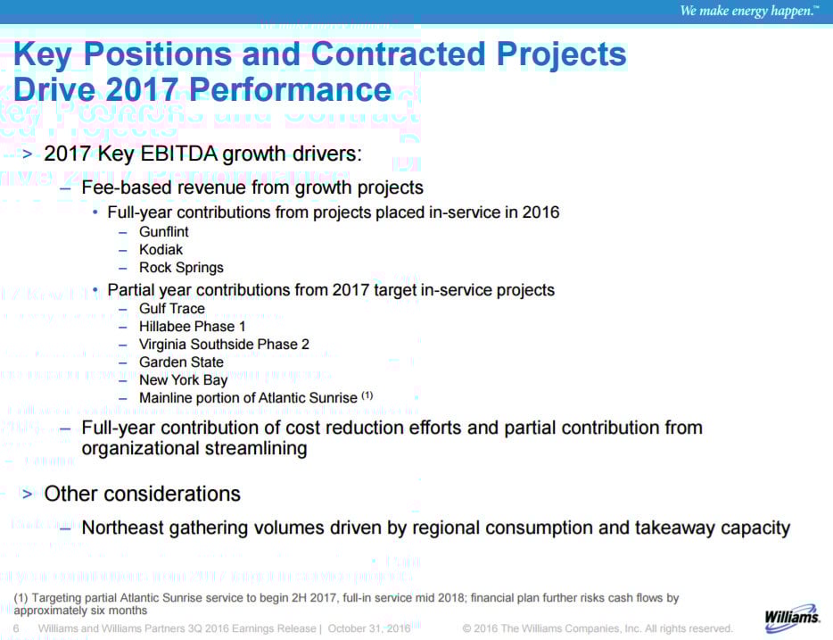 As Armstrong points out, the company has three fairly obvious growth drivers next year. First, it will continue to benefit from the three projects it recently brought online, which will drive growth in the first half of 2017 versus comparable quarters in 2016. In addition to that, Williams Partners has six projects currently under construction that are expected to come online next year and provide incremental earnings and cash flow.