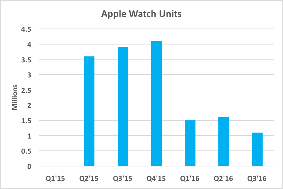 Apple Watch Series 2 was launched at the very end of September in limited supply, so this chart predominantly represents the original Series 1. That also means that there are unlikely to be many upgrades in here, and these sales should be going almost entirely to first-time adopters.