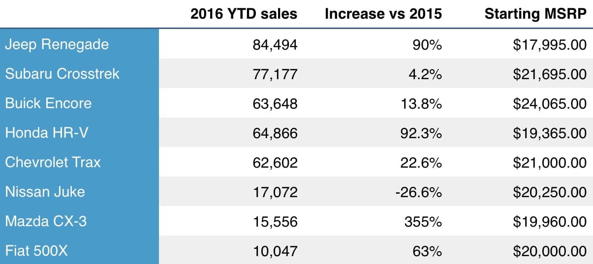 The EcoSport will join a booming U.S. market for small crossovers. The overall U.S. market for "light vehicles" (cars, pickups, and SUVs) has been roughly flat in 2016, but sales of subcompact crossovers as a group are up 32% through October, according to data from Automotive News.