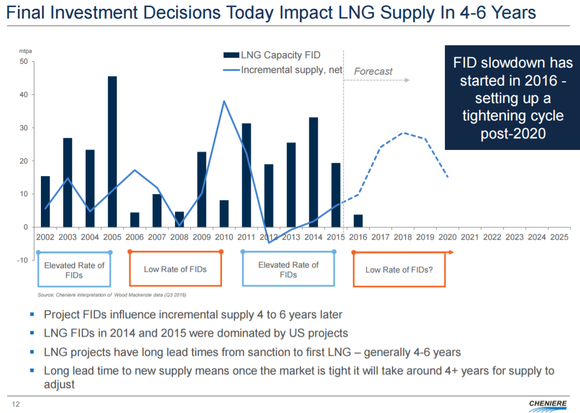 This is clearly setting up a scenario where the LNG market will tighten dramatically by the end of the decade. If customers need supply for early next decade, given the lead time, even for our fully permitted brownfield expansion trains, a final investment decision on new liquefaction capacity would need to come in 2017. With two fully permitted brownfield expansion trains as well as mid-scale modular solutions, that we'll discuss in a minute, under evaluation and the experience to efficiently manage U.S. gas supply needs, Cheniere has the speed and competitiveness to be the next LNG to market.