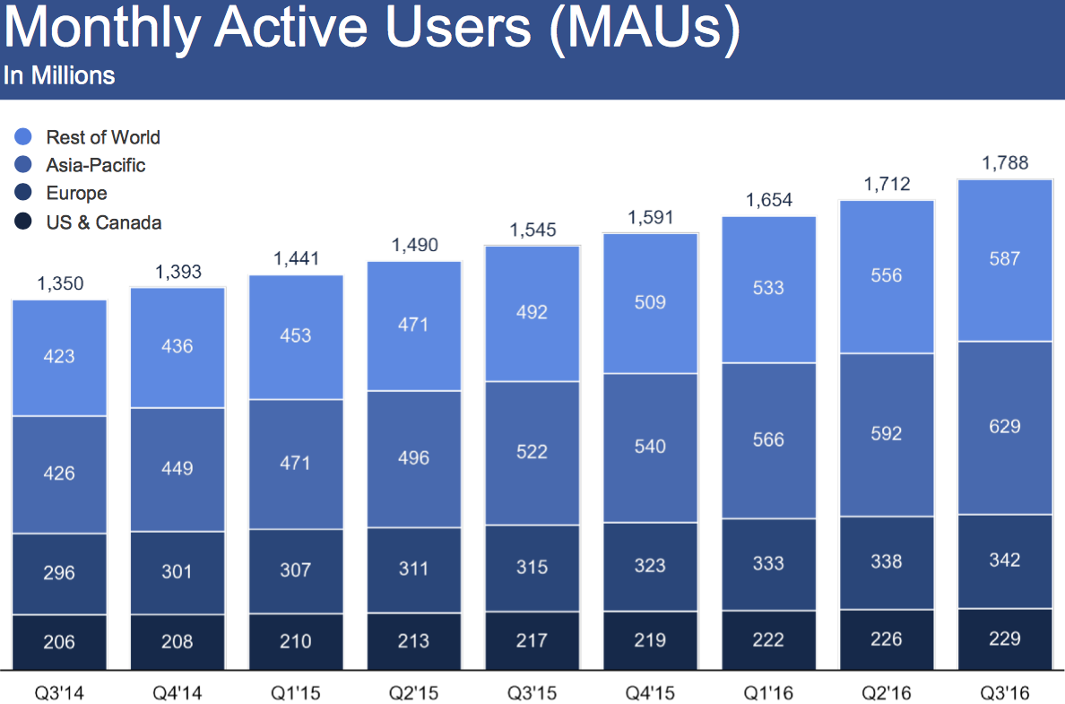 User engagement on Facebook, of course, is just as important as the size of the social network's user base. Fortunately, Facebook isn't letting investors down on this important metric, either. Measured by daily active users as a percentage of monthly active users, Facebook's engagement was 66% in Q3, up from 65% in the third quarter of 2015 and 64% in the same period two years ago.