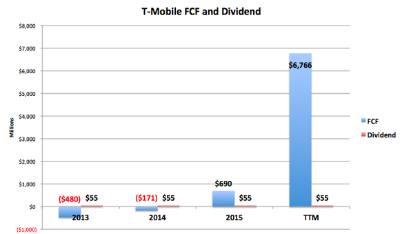 T-Mobile, on the other hand, was FCF negative for both 2013 and 2014. Over the past two years, though, its strategy has really paid off. Over the past 12 months, only a measly 0.8% of FCF was used on the dividend.