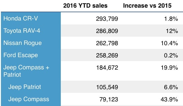 It wasn't a great strategy, and it hasn't yielded great results. The Compass and Patriot compete with huge-selling stalwarts like Honda's (HMC 0.78%) CR-V and Ford's (F 0.84%) Escape, and the Jeeps just haven't kept up. Despite several updates in the years since, the combined total U.S. sales of the two lags far behind the four category leaders, despite strong gains for the outgoing Compass in 2016.