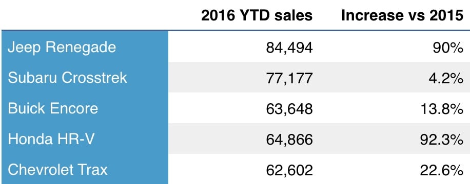 Contrast with the one-size-down subcompact SUV segment, where the (much newer) Jeep Renegade is the clear leader.