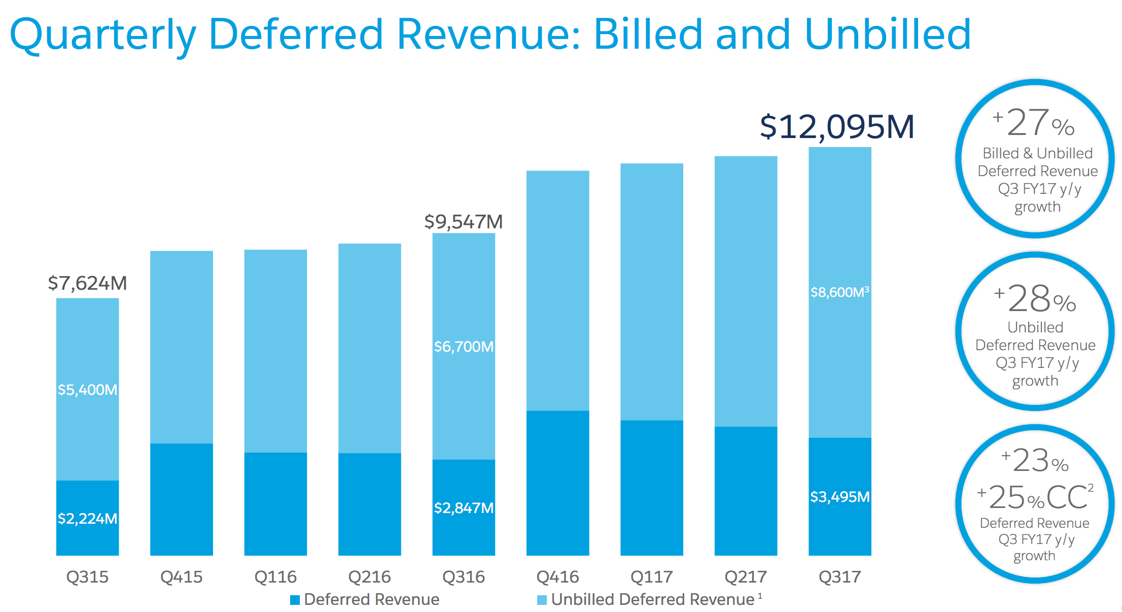 That strong performance is likely to continue in the quarters ahead, with deferred revenue increasing 23% to $3.5 billion Salesforce as of Oct. 31, and unbilled deferred revenue -- essentially business that is contracted but not yet invoiced -- rising 28% to $8.6 billion.