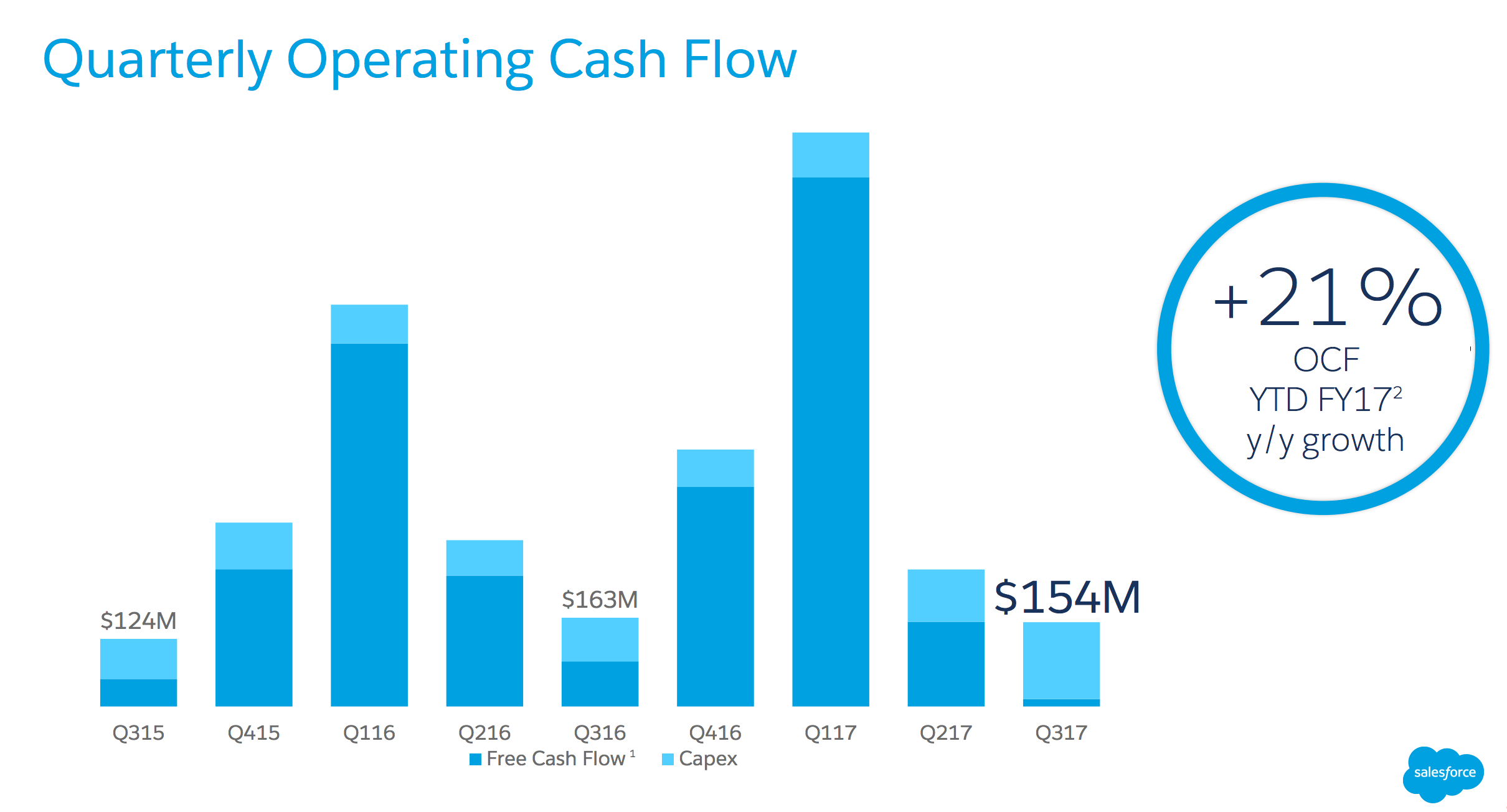 Importantly, Salesforce's revenue growth is also boosting its cash generation, with operating cash flow improving 21%, to more than $1.4 billion, in the first three quarters of fiscal 2017.