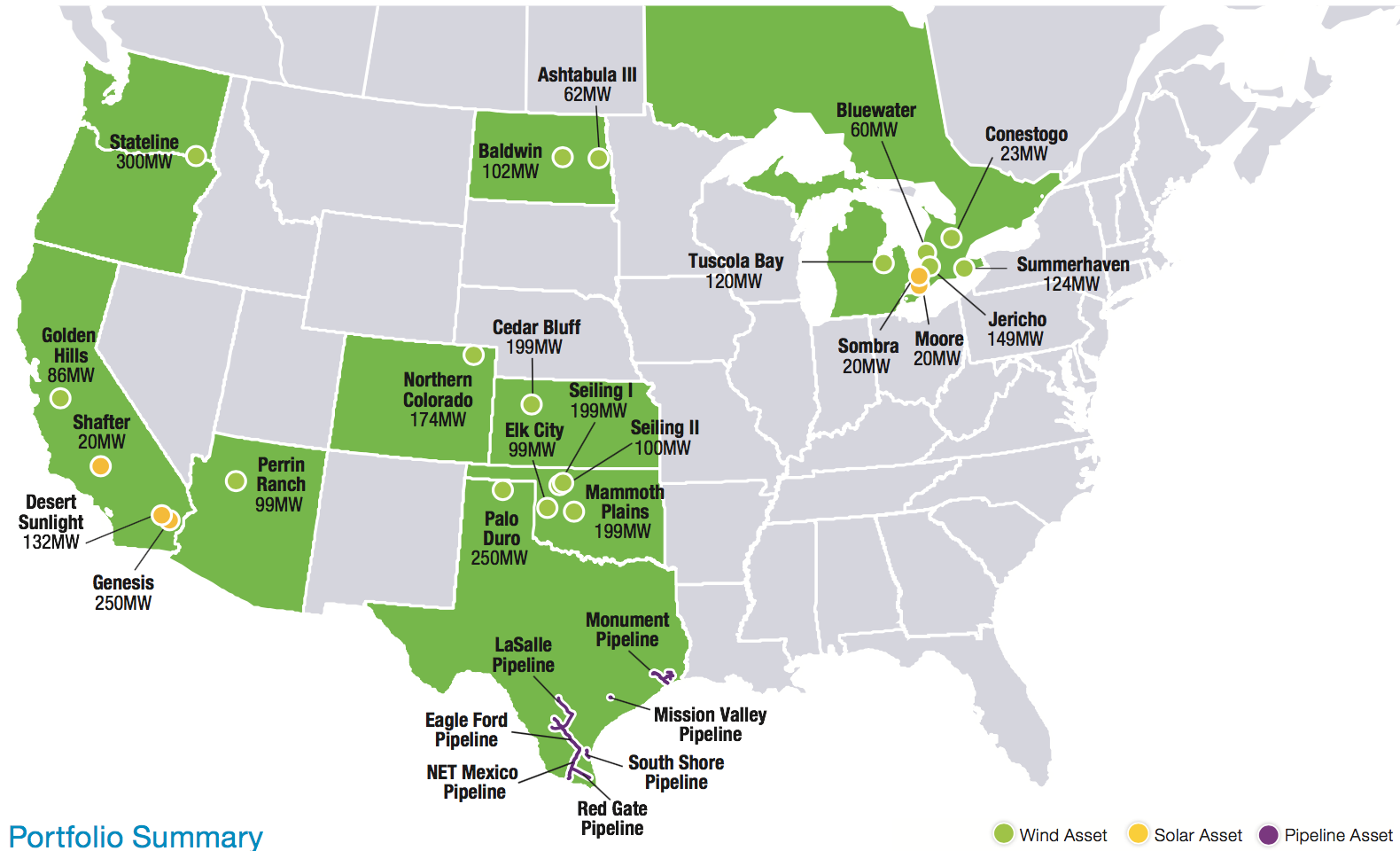 The wind-focused yieldco on this list is Pattern Energy Group (PEGI +0.00%), which owns projects in the U.S., Canada, and Puerto Rico. The company can opportunistically buy assets as they become available because it has a private sponsor, as opposed to public sponsors, which must show consistent growth.
