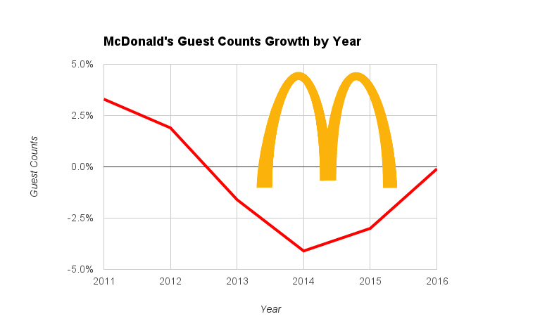 According to Bloomberg, 2016 could be the company's fourth straight year of lower customer counts, as they're coming in 0.1% lower through the third quarter, compared with being 3.1% lower last year. Company filings show guest counts for all of last year were down 3%, compared with a 4% decline in 2014, and they were off 1.6% the year before that.