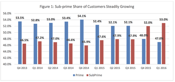 Note that the large drop in EIP receivables at the end of 2015 was due to T-Mobile selling some of the receivables. T-Mobile uses a "proprietary credit scoring model" to evaluate customer credit quality, using numerous factors like credit scores and other profile characteristics. The company then categorizes its EIP receivables as either prime or subprime, and further discloses how much is due under each category. CtW notes that while T-Mobile reduced its allowances as a percentage of receivables, the proportion of subprime customers was actually increasing.