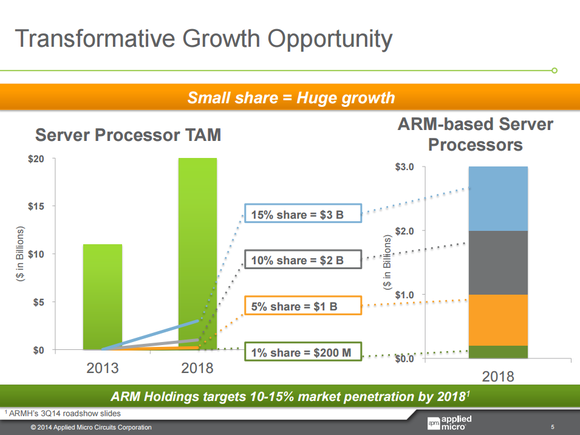 Indeed, Applied Micro expected that the server processor total addressable market in 2018 would be around $20 billion. The company pitched to investors that because of its size, capturing relatively small market share would mean "huge growth" for Applied Micro.