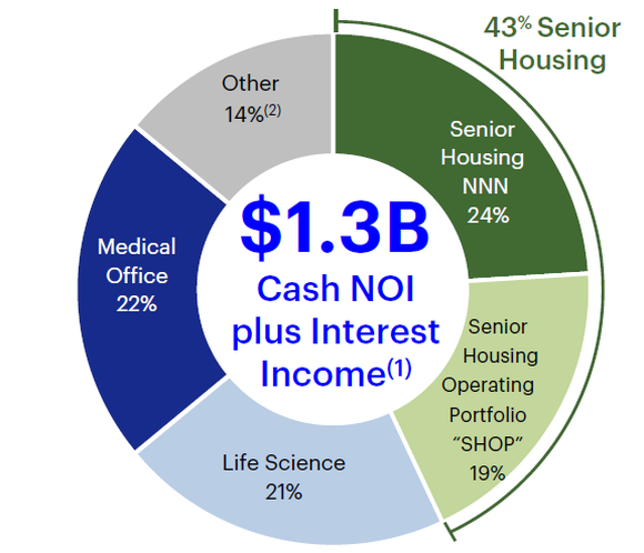 More importantly, the U.S. population is aging rapidly, with the senior-citizen (65+) population expected to roughly double by 2050. Seniors spend five times as much on healthcare per person as the overall population, which translates to rapid growth in the most lucrative part of the healthcare market. This is especially good for HCP, since senior housing is the company's largest property type.