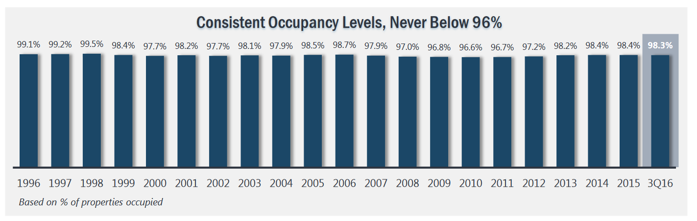 Because of the combination of rental income and property-value appreciation, the company has produced some impressive returns for its investors. Since its 1994 NYSE listing, Realty Income has averaged a total return of 17.9% per year -- a total of more than 3,700% in 22 years. I'm not saying that this level of performance will continue, but I don't see any reason to believe the company can't beat the returns of the market going forward.