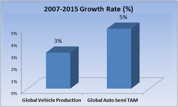 Thus, it can be safely said that the growing automotive chip market is one of the most important reasons Qualcomm is buying NXP. In fact, the market for automotive semiconductors is growing at a faster pace than auto production, as shown below.
