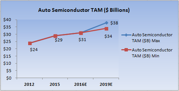 As more semiconductors are used in new vehicles, the total size of the automotive chip industry will also grow. NXP forecasts that the market size will grow from 2015's $29 billion to a midpoint estimate of $36 billion in 2019, a 24% increase.