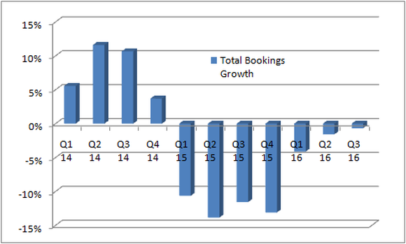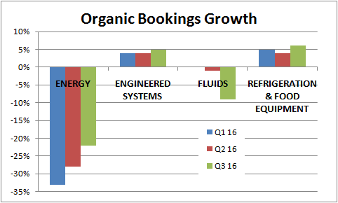 On the other hand, Dover's guidance has clearly been overly optimistic, and the unwelcome production problems in refrigeration -- due to what CEO Bob Livingston described as "complexity that we've added into the organization with many new customers and smaller product lots" -- have disappointed investors. Moreover, a look at organic bookings growth shows that underlying conditions actually got worse in the company's fluids segment in the third quarter.